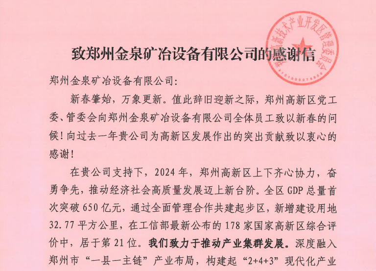 鄭州高新區(qū)贈(zèng)予鄭州金泉感謝信2024年,鄭州高新區(qū)GDP總量首次突破650億元,通過(guò)全面管理合作共建起步區(qū),新增建設(shè)用地32.77平方公里,貴公司2024年加足馬力拼生產(chǎn)克難攻堅(jiān)拓市場(chǎng),實(shí)現(xiàn)產(chǎn)值15395.7萬(wàn)元,增速97...2025-02-18 -